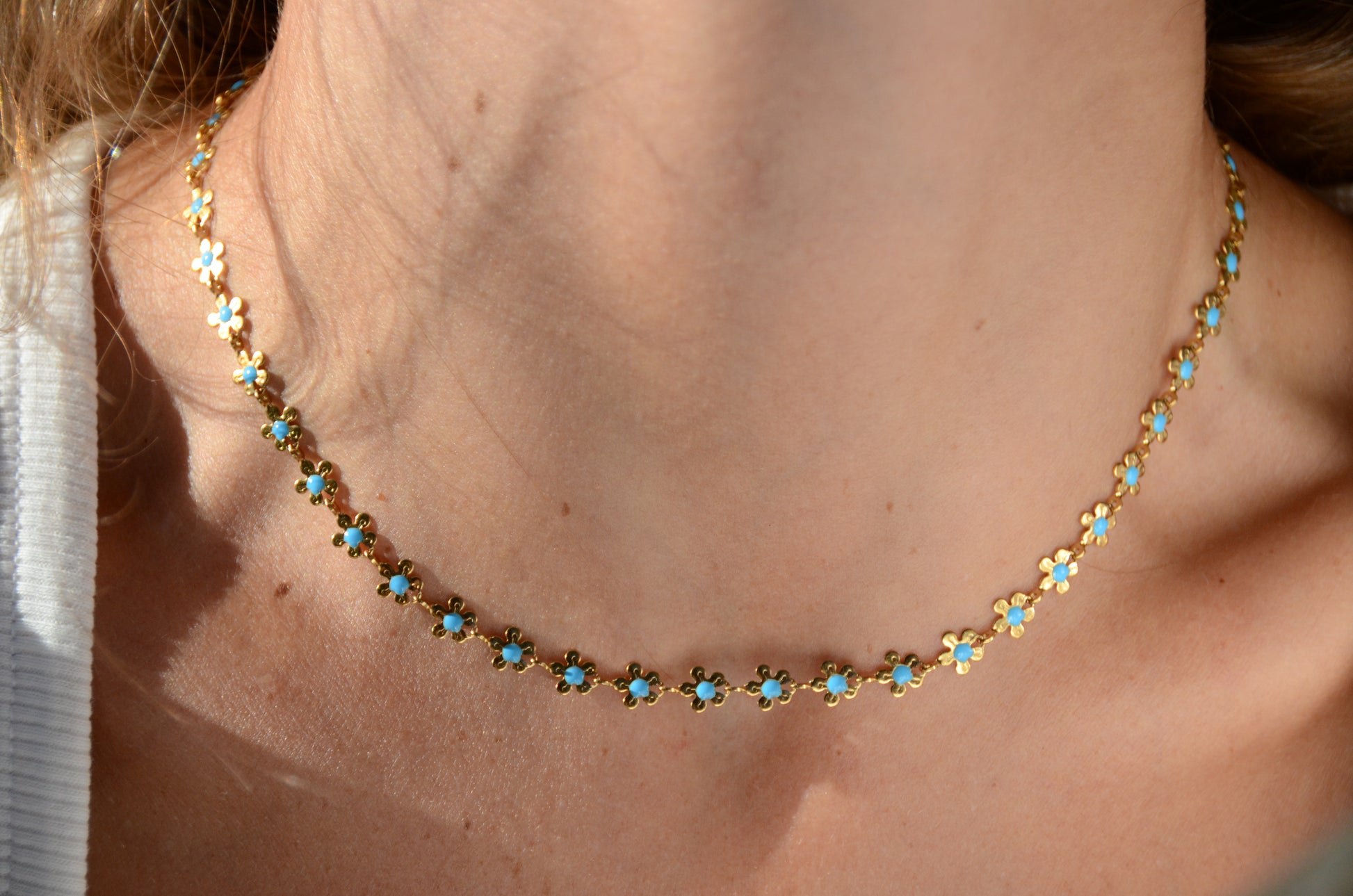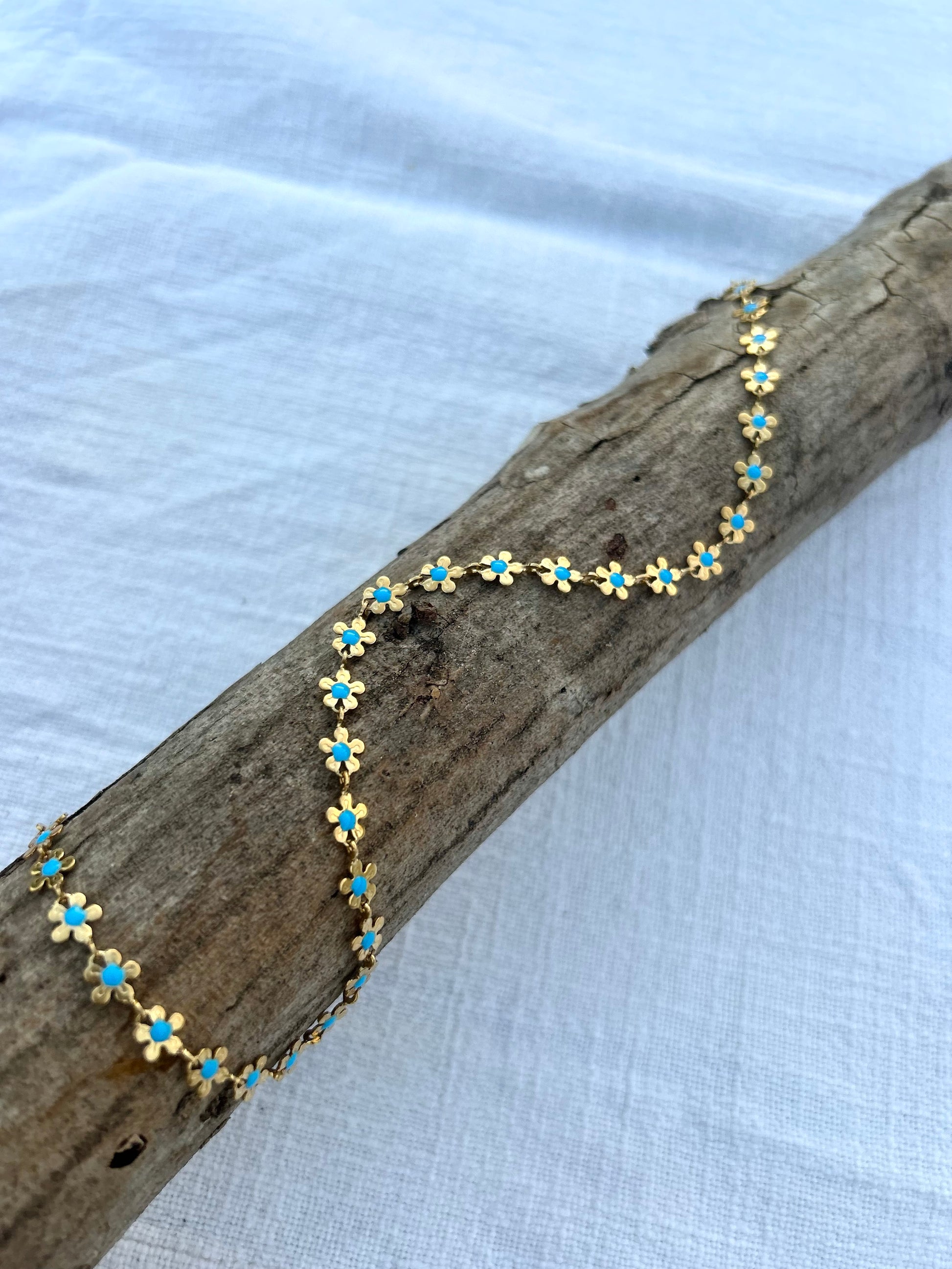 שרשרת פרחונית מצופה זהב בעיצוב ססגוני. היא משלבת מראה צעיר וסטייל, ומעניקה לכל הופעה נגיעה של זוהר ופריחה.